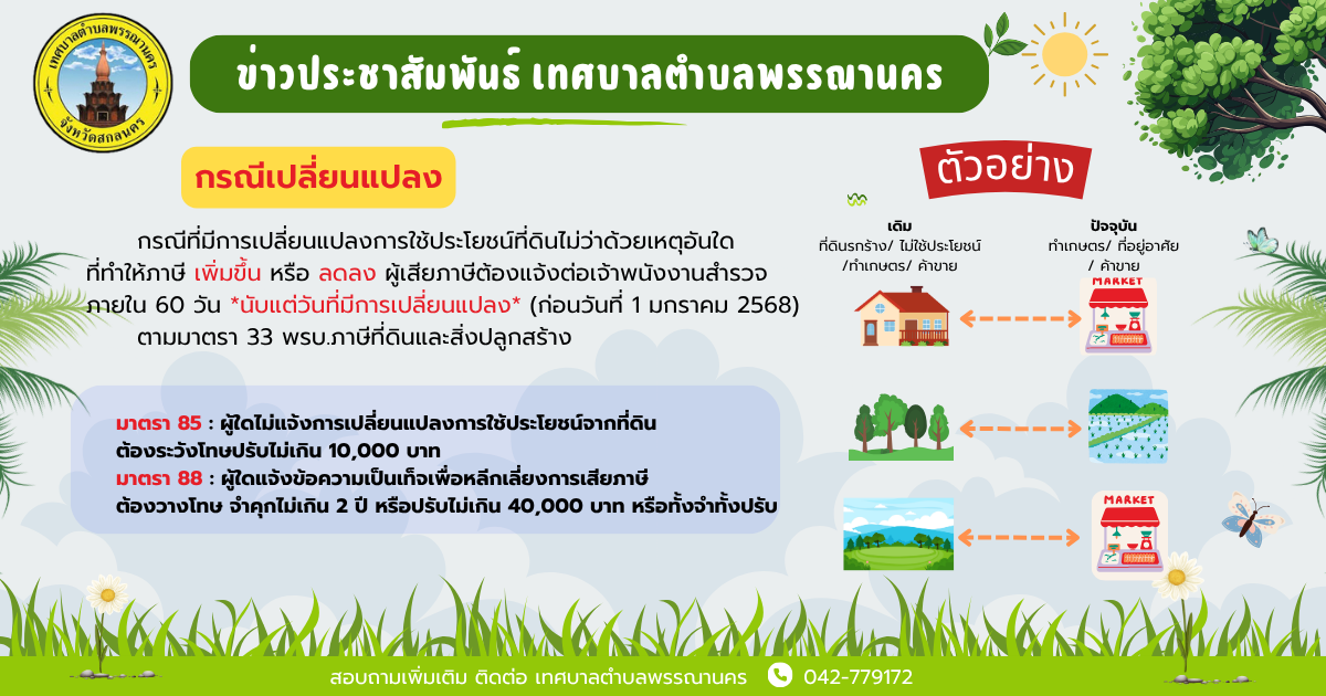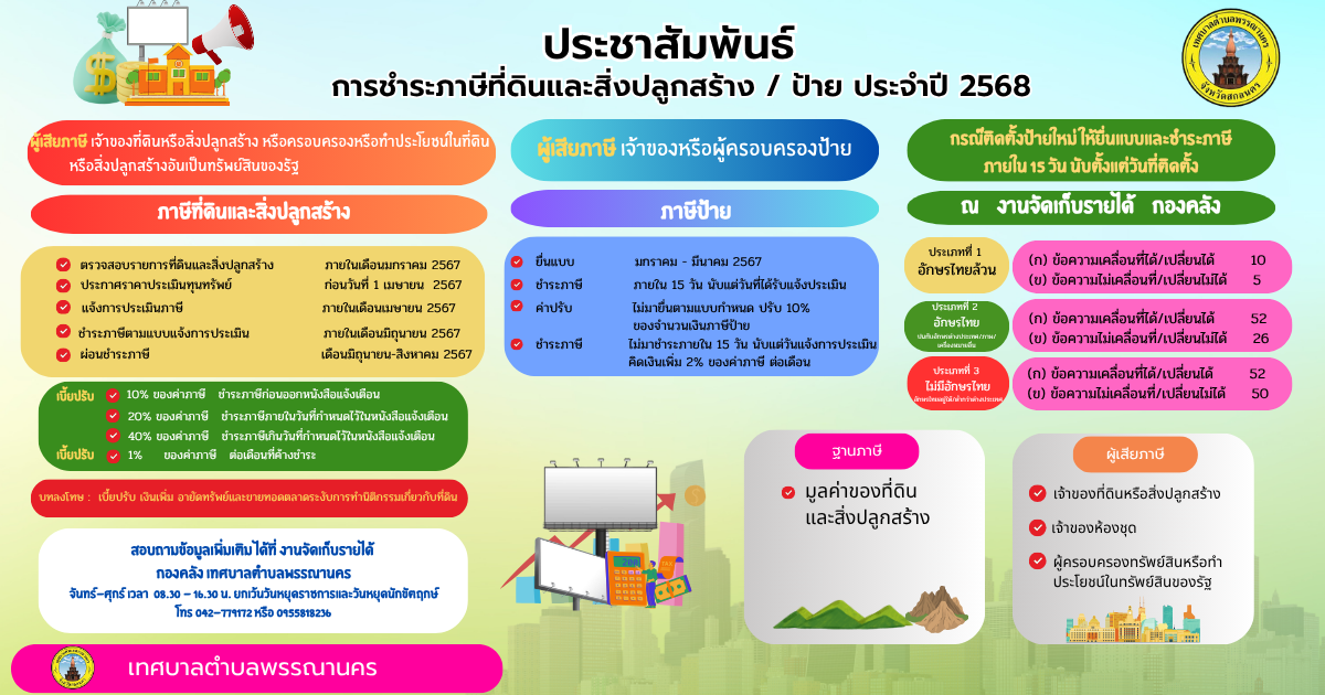 🛑แจ้งกำหนดระยะเวลาการชำระ ภาษีที่ดินและสิ่งปลูกสร้าง และช่องทางการชำระเงินค่าภาษีของเทศบาลตำบลพรรณนคร